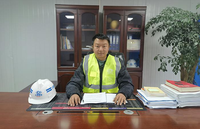 我們乘坐的車輛從學(xué)校東門駛?cè)?,李林澤與崗?fù)け0矒]手致意,對方立刻放行,想來彼此已經(jīng)非常熟絡(luò)。來到項目部門口,我立刻被這潔凈美觀的小院所吸引:地面一塵不染,車輛停放整齊;花壇里的粉色月季競相綻放,環(huán)繞項目部的草地生氣勃勃,顯出與初冬季節(jié)相悖的濃濃翠意;L形的兩棟二層活動板房上分別張貼著“傳承發(fā)揚敬業(yè)、專注、精益、創(chuàng)新的工匠精神,執(zhí)著于打造精品工程和提供優(yōu)質(zhì)服務(wù)”“只有干好今天的現(xiàn)場,才能贏得明天的市場”標(biāo)語,小院靜謐而溫馨。