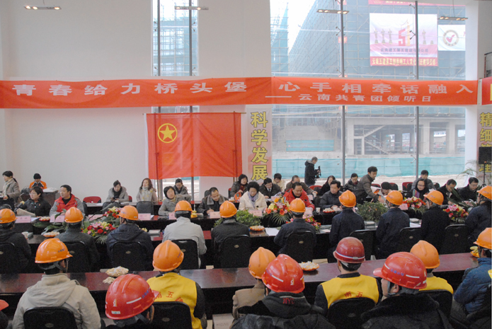 技術(shù)支持: 方森科技 2011年1月16日下午,共青團(tuán)云南省委邀請(qǐng)部分省人大代表、省政協(xié)委員、昆明市12355青少年服務(wù)臺(tái),青少年事務(wù)教授、專家、律師到公司承建的昆明市工人文化宮遷建項(xiàng)目工地開展主題為“青春給力橋頭堡 心手相牽話融入”的“云南共青團(tuán)傾聽日”活動(dòng),傾聽現(xiàn)場(chǎng)青年的心聲。共青團(tuán)云南省委書記、省人大常委饒南湖,集團(tuán)公司副總經(jīng)理?xiàng)顫?,黨委委員、黨委工作部部長(zhǎng)陳發(fā)強(qiáng),團(tuán)委副書記雷棲,公司副總經(jīng)理李興奎出席活動(dòng)并與青年們座談。團(tuán)省委權(quán)益部部長(zhǎng)吳琳、楊濤在座談會(huì)上發(fā)言。座談會(huì)由共青團(tuán)云南省委副書記楊金瑩主持。